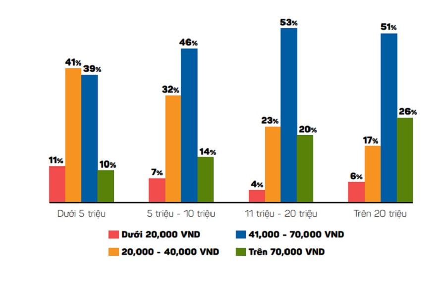 Mức chi 41.000-70.000 đồng/lần “đi cà phê” chiếm tỷ trọng lớn trong nhóm những người có mức thu nhập từ 5 triệu đồng/tháng trở lên. Đối với những người có thu nhập dưới 5 triệu/tháng, mức chi 20.000-40.000 đồng/lần.