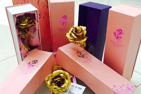 Một cửa hàng quà tặng trên đường CMT8, quận 10, rao bán loại bông hồng dát vàng 24k, chỉ có giá 300.000 đồng. Người bán cho biết, đây là sản phẩm bán chạy nhất ở các dịp lễ 14/2, 8/3, 20/10. Cần số lượng bao nhiêu cũng có, nếu mua trên 10 bông giá chỉ còn 280.000-290.000/bông. Phải đặt sớm, nếu chờ đến cận ngày 8/3 sẽ không còn hàng. Khi hỏi về chất lượng vàng 24k, người bán lý giải “hoa có màu vàng kim giống vàng, nên gọi là hoa hồng 24k, chứ không phải vàng thiệt. Vàng thiệt không thể có giá này, rất giống với hàng xịn nên được nhiều người chọn làm quà”.