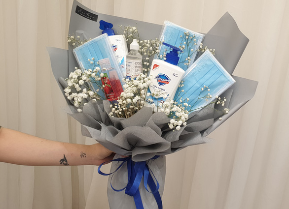 Nắm bắt được tâm lý này, một cửa hàng hoa tại TP.HCM vừa cho ra mắt món quà Valentine thời virus corona là bó hoa được đính kết từ hoa baby và các vật dụng y khoa như khẩu trang y tế, cồn 90 độ, gel rửa tay khô, dung dịch rửa tay với các màu xám, trắng, xanh, đỏ hoà quyện.