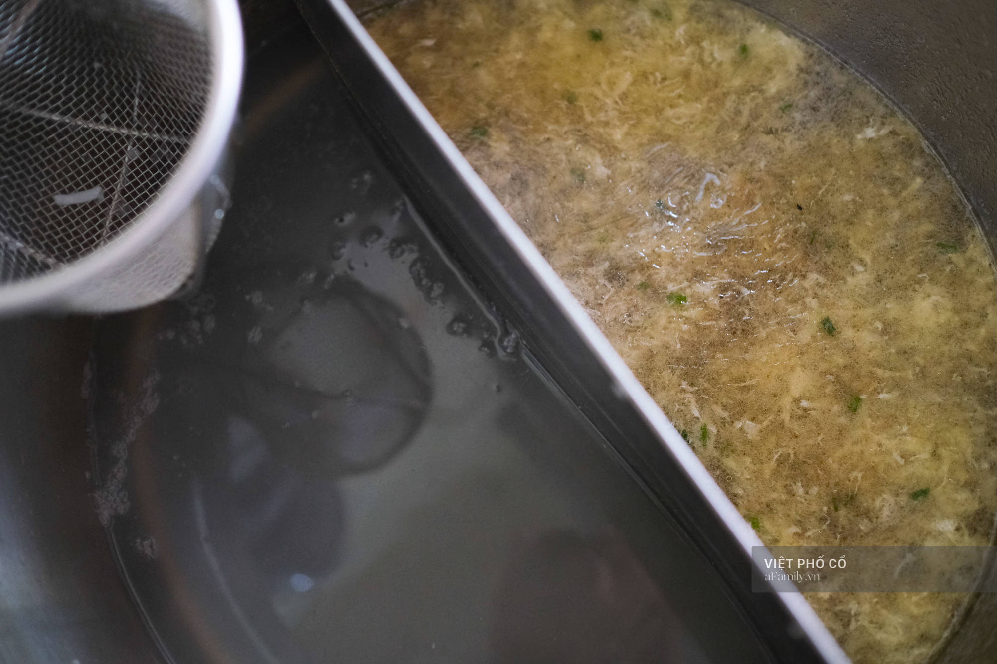 Mà đâu chỉ nước dùng, chú Khôi còn chú trọng cả chuyện... nước chần phở nữa. Chú đặt làm một cái nồi 70 lít thì hết 35 lít là nước chần phở, chiếm một khoang to bè, còn khoang thon hơn chứa nước dùng sóng sánh tủy bò nhừ tan nổi lên trên mặt, được chần cách thủy. Nồi kiểu này, quả thực hiếm thấy ở các hàng phở. Thường thì, người ta sẽ làm khoang nước chần bé thôi, và khoang nước dùng sẽ “chạm” lửa hoặc đáy đun điện.