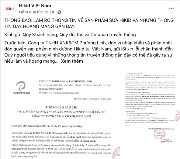 Liên quan đến những nội dung quảng cáo trên, trên một số fanpage "Hikid - Cao Lớn Vượt Trội", fanpage "Hikid Việt Nam" cùng nhiều trang mạng xã hội khác đã đăng tải và chia sẻ tài liệu ký tên " Thông cáo báo chí làm rõ thông tin về sản phẩm Hikid và cam kết từ Công ty TNHH XNK & TM Phương Linh". Được biết, công ty này là đơn vị nhập khẩu và phân phối độc quyền Hikid tại Việt Nam.
