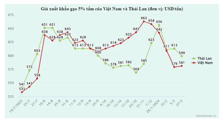 Đến ngày 27/3, giá gạo xuất khẩu loại 5% tấm và 25% tấm của Việt Nam giảm lần lượt về mức 582 USD/tấn và 558 USD/tấn. Trong khi đó, giá gạo cùng loại của Thái Lan lần lượt ở mức 599 USD/tấn và 551 USD/tấn.