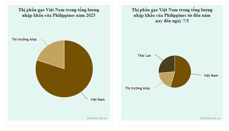 Trong năm 2023, Việt Nam xuất khẩu sang Philippines 3,1 triệu tấn gạo, kim ngạch đạt 1,75 tỷ USD, tuy giảm 2% về lượng nhưng tăng tới 17,6% về giá trị so với năm trước đó. Gạo của Việt Nam chiếm thị phần trên 80% tại thị trường Philippines.
