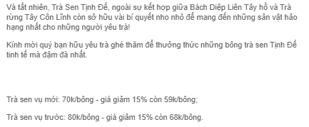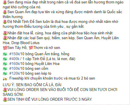 Ngoài ra, giá thành đắt của sen Tịnh Đế cũng vì có sen hay không còn phụ thuộc vào đầm sen chứ không phải người bán. Nếu muốn mua sen thì luôn phải đặt trước với họ và việc phải chờ đợi nhiều ngày là rất bình thường".