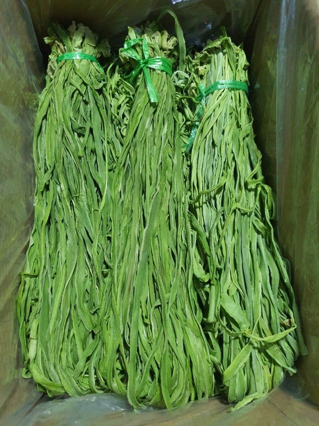 Chị Hoa - một tiểu thương bán nông sản online - cho biết: “Từ trước Tết khá sớm, nhà tôi đã tuyển chọn rau tiến vua tươi loại 1, cọng to về phơi. Loại rau này càng ngày càng ít, lượng người khai thác cũng không nhiều nên nguồn cung không dồi dào. Trung bình cứ 5-7kg rau tươi là được 1kg rau khô, hiện cửa hàng có khoảng 50kg, chỉ đủ để giao cho những ai đặt trước”.