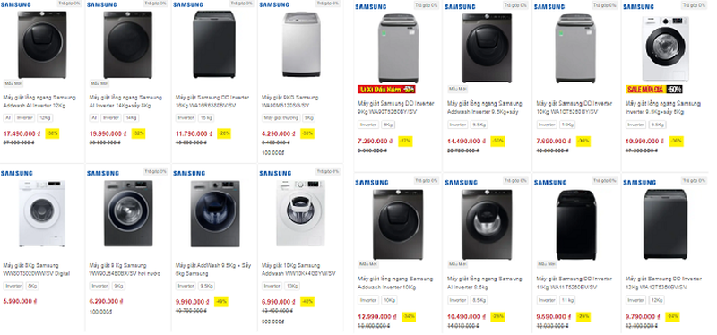 Tại một hệ thống siêu thị điện máy tại Hà Nội, máy giặt Samsung Inveter 9kg lồng ngang đang được giảm đến 41%, từ 17,1 triệu đồng xuống chỉ còn 9,9 triệu đồng; máy giặt Samsung AddWash Inverter 9,5 kg lồng ngang cũng giảm tới 49%, từ 19,7 triệu đồng xuống còn gần 10 triệu đồng; máy giặt Samsung Addwash Inveter 10kg giảm 48%, từ 13,4 triệu đồng xuống còn gần 7 triệu đồng…