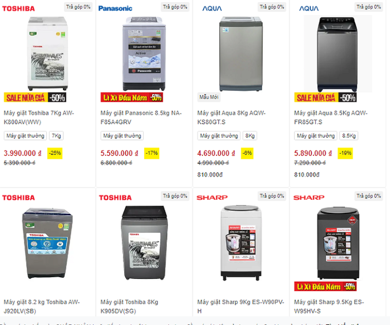 Một siêu thị điện máy khác, áp dụng giảm giá đến 57% cho sản phẩm máy giặt Samsung Inverter 8kg WW80T3020WW/SV lồng ngang, giá từ 12,4 triệu đồng xuống còn gần 5,4 triệu đồng; máy giặt Samsung Inverter 8,5 kg WW85T4040CE/SV lồng ngang cũng giảm 49%, từ 13,5 triệu đồng về giá 6,9 triệu đồng.