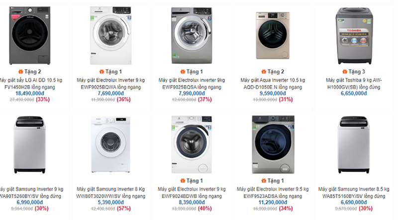 Điển hình như: Máy giặt LG lồng đứng 9,5kg T2395VS2W Smart Inverter giảm 29%, từ giá 7,7 triệu đồng về mức 5,4 triệu đồng; máy giặt LG lồng đứng 10,5kg T2350VS2W Smart Inverte giảm 12%, từ 8 triệu đồng xuống còn gần 7 triệu đồng; máy giặt LG Inverter lồng đứng 11kg TH2111SSAL TurboWash3D giảm 38%, từ 13,9 triệu đồng xuống còn 8,4 triệu đồng; máy giặt lồng ngang LG Inverter 10,5gk FV1450S3W giảm 47%, từ gần 19 triệu đồng xuống chỉ còn gần 10 triệu đồng.