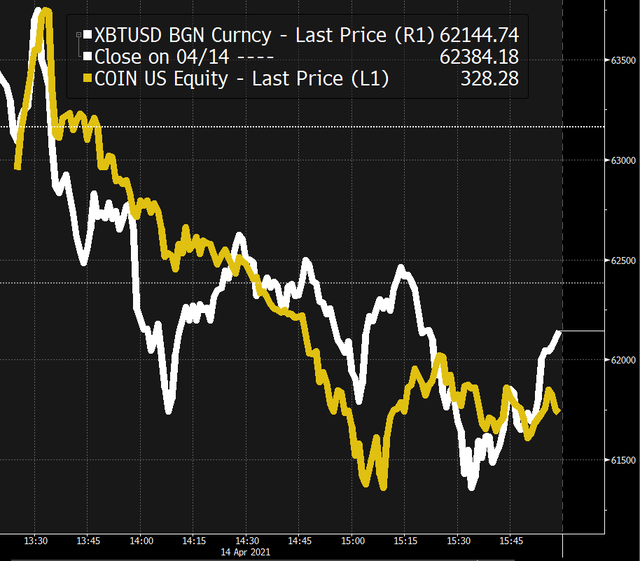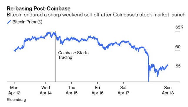 Có lúc, Bitcoin giảm 20,3% từ mức đỉnh lập được ngay trước khi Coinbase – sàn giao dịch tiền số lớn nhất thế giới bắt đầu giao dịch cổ phiếu vào ngày thứ 4. Thật khó để tin rằng việc Coinbase chào sàn không có bất kỳ ảnh hưởng gì tới sự sụt giảm này của Bitcoin. Đây là những gì đã diễn ra với cổ phiếu Coinbase và giá Bitcoin vào buổi chiều ngày thứ 4: