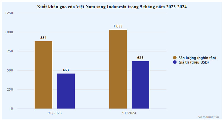 Số liệu thống kê sơ bộ từ Tổng cục Hải quan cho thấy, chỉ trong 9 tháng năm nay, nước ta đã xuất khẩu sang thị trường Indonesia 1,03 triệu tấn gạo, thu về 625 triệu USD. So với cùng kỳ năm ngoái, xuất khẩu gạo sang “xứ sở vạn đảo” tăng 16,9% về lượng và tăng mạnh 35% về giá trị.