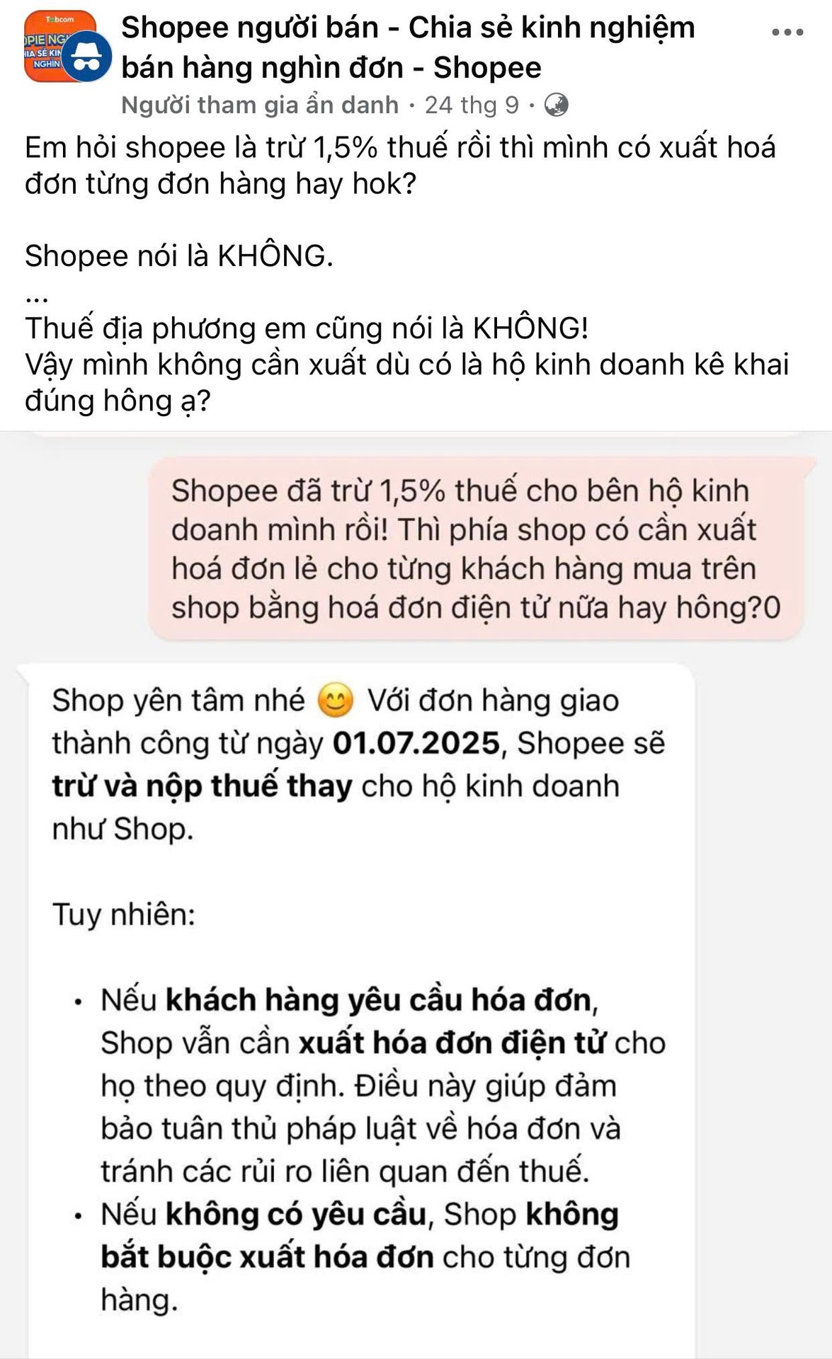 Vị độc giả này cũng chia sẻ, đã trao đổi làm việc với Shopee thì nhận được câu trả lời: Không phải xuất hoá đơn. Đồng thời, người này cũng cho biết, có hỏi cơ quan thuế quản lý và nhận được câu trả lời tương tự.