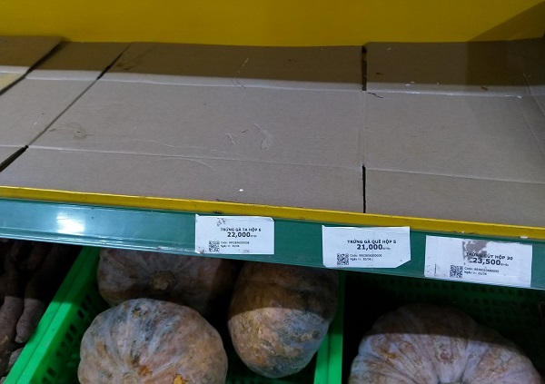 Trong khi đó, tại chợ Bà Chiểu (quận Bình Thạnh), mặt hàng trứng vẫn khan hiếm và giá vẫn ở mức rất cao. Trứng vịt có giá 50.000 đồng/chục (so với 55.000 đồng/chục của ngày hôm qua), trứng gà có giá 40.000 đồng/chục, nhưng một số sạp hàng cũng không có trứng để bán. Siêu thị cũng hết mặt hàng trứng từ khoảng 8h sáng.