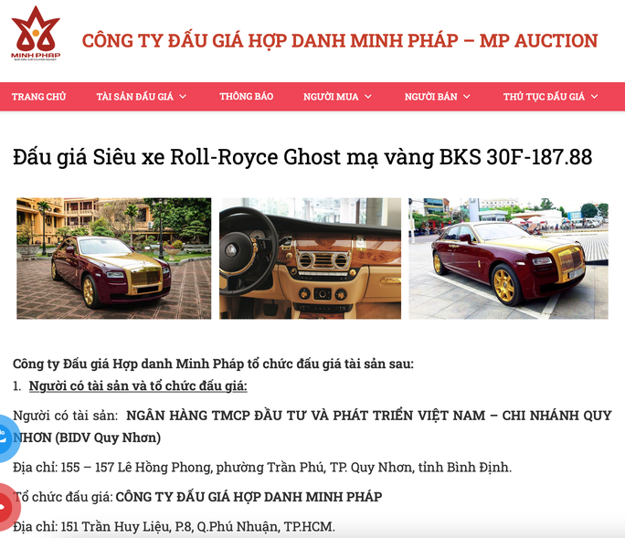 Trang web Công ty Đấu giá Hợp danh Minh Pháp vừa đăng tải thông tin về việc tổ chức đấu giá siêu xe Roll-Royce mạ vàng biển số 30F-187.88. Xe được sản xuất năm 2011 tại Anh; đăng ký lần đầu ngày 24-5-2018.