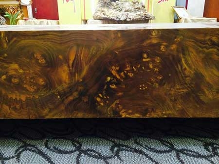 Để chứng minh, anh Trình dẫn chúng tôi vào gian hàng phía bên trong, nơi có trưng bày chiếc sập gỗ ngọc nghiến có giá 1,5 tỷ đồng. Anh nói: “Chiếc sập gỗ này có chiều dài 2,3m, rộng 1,7m, dày 28 cm, nặng khoảng 1,3 tấn. Sập được làm từ ngọc nghiến nguyên khối, được lấy từ thân cây nghiến có đường kính 5m trên rừng ở Na Hang (Tuyên Quang)”.