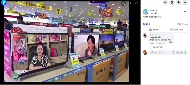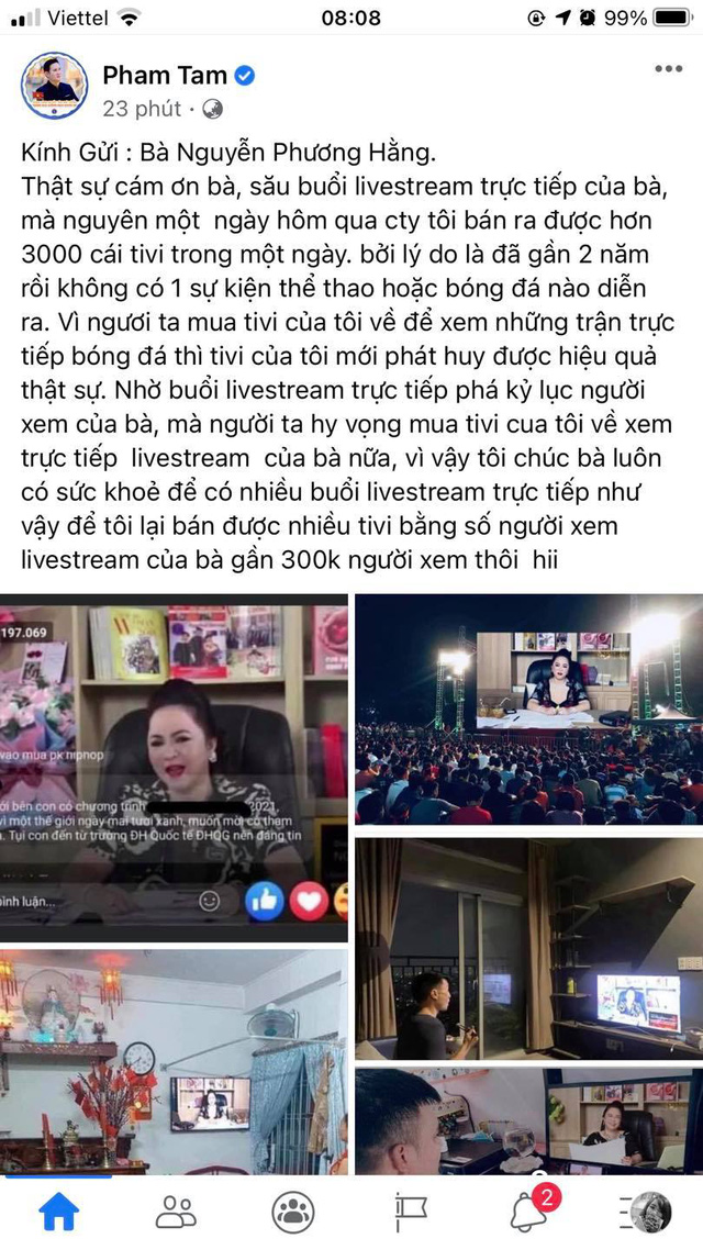 Nhờ buổi livestream trực tiếp phá kỷ lục người xem của bà, mà người ta hy vọng mua tivi cua tôi về xem trực tiếp livestream của bà nữa, vì vậy tôi chúc bà luôn có sức khoẻ để có nhiều buổi livestream trực tiếp như vậy để tôi lại bán được nhiều tivi bằng số người xem livestream của bà gần 300.000 người xem thôi", một dòng trạng thái trên tài khoản Facebook của ông Tam (có tick xanh) ghi.