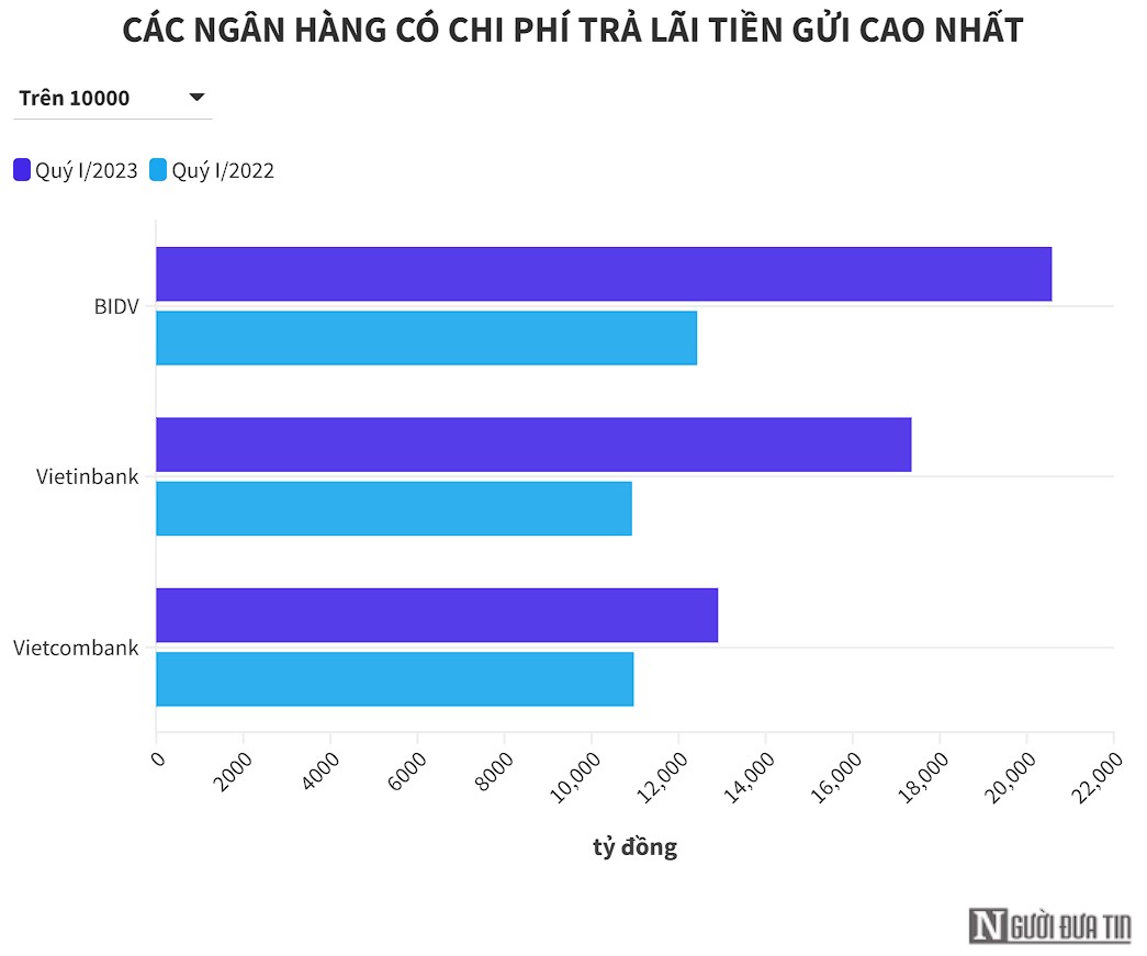 Người Đưa Tin thống kê từ báo cáo tài chính quý I/2023 của các ngân hàng, nhận thấy chi phí trả lãi tiền gửi của các ngân hàng tăng đột biến so với cùng kỳ năm trước.