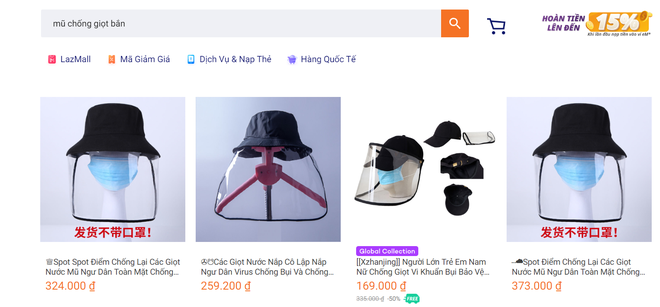 Trên các trang thương mại điện tử, các loại mũ có tấm chống bụi và giọt bắn từ nước bọt xuất xứ Trung Quốc cũng đang được bán với giá dao động từ 150.000 -324.000 đồng/chiếc.