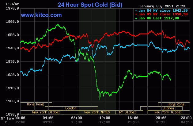 Đến sáng nay (7/1 giờ Việt Nam), giá vàng đã có dấu hiệu hồi phục trở lại. Hiện giá vàng giao ngay đứng ở mức 1.919 USD/ounce. Tính theo tỷ giá, hiện giá vàng thế giới tương đương 53,6 triệu đồng/lượng, thấp hơn hơn 3 triệu đồng mỗi lượng so với giá vàng trong nước.