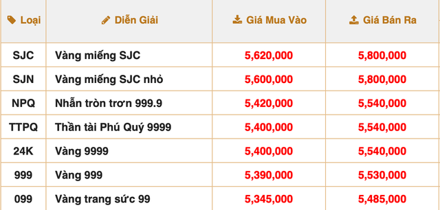 Cụ thể, lúc 8h20, tập đoàn Phú Quý niêm yết giá vàng miếng SJC ở mức 56,00-58,00 triệu đồng/lượng, tăng hơn 1 triệu đồng/lượng so với cuối phiên hôm qua.