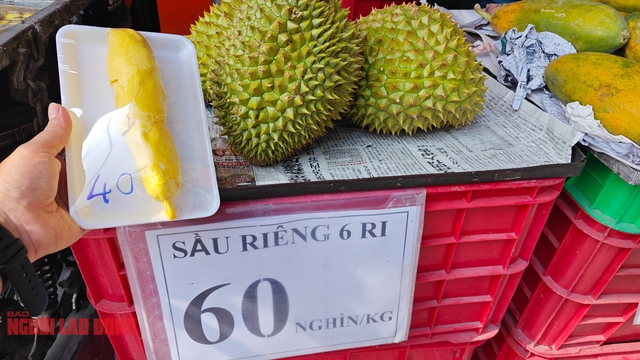 Tại một điểm bán trái cây ở hẻm đường Trường Sa (quận Bình Thạnh), sầu riêng Ri 6 còn 60.000 đồng/kg, giảm 30.000 đồng/kg so với gần 1 tháng trước. Chủ cửa hàng liên tục giới thiệu khách hàng nên tranh thủ mua bởi sầu riêng đang có giá rẻ hiếm có.