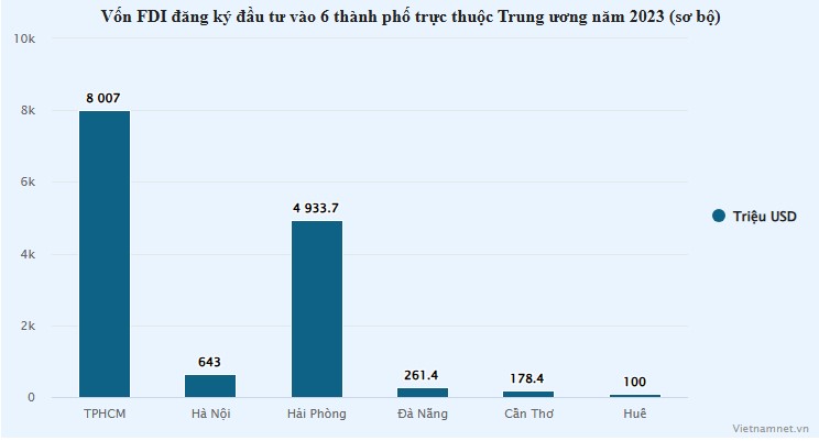 Số vốn FDI đăng ký đầu tư trong năm 2023 tại các thành phố còn lại ghi nhận mức khá khiêm tốn, như: Hà Nội có 643 triệu USD; Đà Nẵng 261,4 triệu USD; Cần Thơ 178,4 triệu USD và Huế chỉ 100 triệu USD.