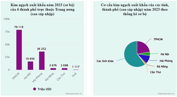 Về xuất khẩu hàng hoá năm 2023, thống kê sơ bộ từ Cục Hải quan cho thấy, TPHCM tiếp tục dẫn đầu với kim ngạch xuất khẩu đạt gần 79,12 tỷ USD, cao hơn tổng kim ngạch xuất khẩu của Hà Nội (gần 16,66 tỷ USD), Hải Phòng (trên 36,25 tỷ USD), Đà Nẵng (gần 3,68 tỷ USD), Cần Thơ (gần 3,7 tỷ USD) và Huế (gần 1,12 tỷ USD) cộng lại.