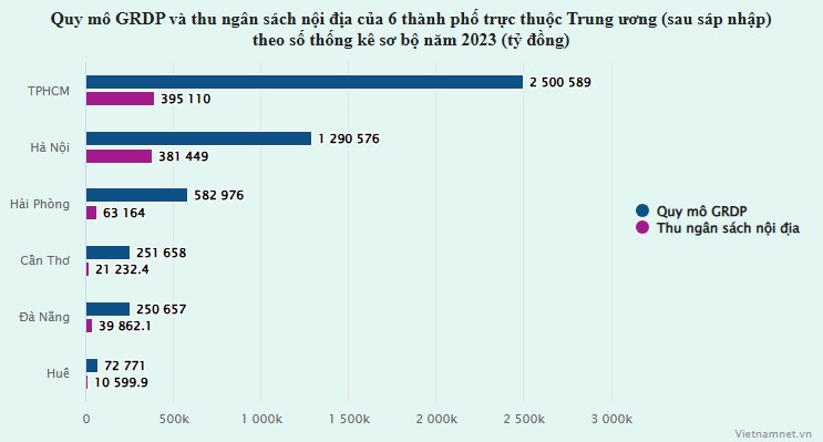 Theo đó, 6 thành phố này có quy mô GRDP gần 5 triệu tỷ đồng, chiếm khoảng 50% GDP của cả nước trong năm 2023.