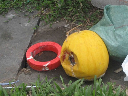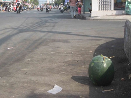Trái dưa hấu này đã được chủ nhân cắt phần mặt nhưng do không ăn được nên vứt ra lề đường Mậu Thân |