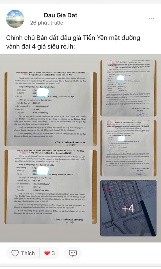 Theo ghi nhận của PV Tiền Phong, sau khi có kết quả trúng đấu giá phiên đấu giá quyền sử dụng đất ở đối với 20 thửa đất (LK01 và LK02), thuộc Dự án Hạ tầng kỹ thuật đấu giá quyền sử dụng đất trên địa bàn xã Tiền Yên - xứ đồng Lòng Khúc (huyện Hoài Đức, Hà Nội), nhiều lô đất được rao bán trên thị trường với giá chênh hàng trăm triệu đồng.
