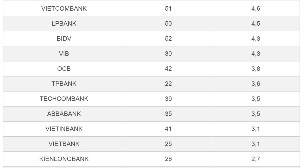 Nhóm các ngân hàng có mức chi bình quân trên 3 tỷ đồng/người lần lượt gồm: OCB, TPBank, Techcombank, ABBank, VietinBank, VietBank.