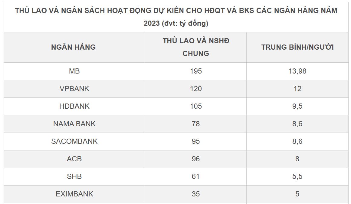 Theo thống kê của Vietnamnet, sau mùa Đại hội cổ đông, MBBank, VPBank, HDBank, NamA Bank, Sacombank, và ACB là những ngân hàng mạnh tay chi thù lao, thưởng, ngân sách hoạt động cho ban lãnh đạo bao gồm Hội đồng quản trị (HĐQT) và Ban kiểm soát (BKS) trong năm 2023.