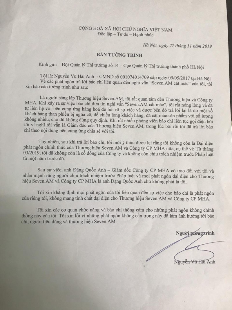 Cụ thể hơn, trong bản tường trình, ông Hải Anh nêu rõ: “Là người sáng lập Thương hiệu SEVEN.am, tôi rất quan tâm đến Thương hiệu và Công ty MHA. Khi xảy ra sự việc báo chí đưa tin nghi vấn “SEVEN.am cắt mác”, tôi rất nóng lòng và đã tự liên hệ với bên cung ứng hàng hoá để hỏi rõ sự việc và được bên đó trả lời lại do một số khách hàng than phiền bị ngứa cổ, để chiều lòng khách hàng, đã cắt mác sản phẩm với số lượng không nhiều, cho dù không đúng quy định. Khi rất nhiều phóng viên báo chí liên tục gọi điện hỏi tôi vì nghĩ tôi vẫn là Giám đốc của Thương hiệu SEVEN.am, trong lúc bối rối, tôi đã trả lời báo chí theo nội dung bên cung ứng chia sẻ với tôi.