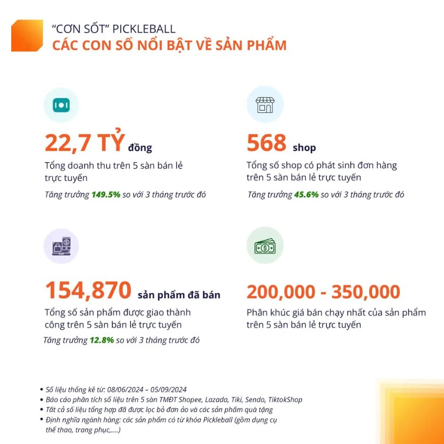 Hồi tháng 9, nền tảng phân tích dữ liệu thương mại điện tử Metric công bố số liệu cho thấy từ ngày 8/6 đến 5/9/2024, tổng doanh thu các sản phẩm liên quan đến pickleball trên 5 sàn Shopee, Lazada, Tiki, Sendo và TikTok Shop lên đến 22,7 tỷ đồng, tăng 149,5% so với 3 tháng trước đó. Xét về số lượng sản phẩm, 154.870 sản phẩm đã được giao thành công, tăng trưởng 12,8%. Phân khúc giá bán chạy nhất là 200.000 – 350.000 đồng.
