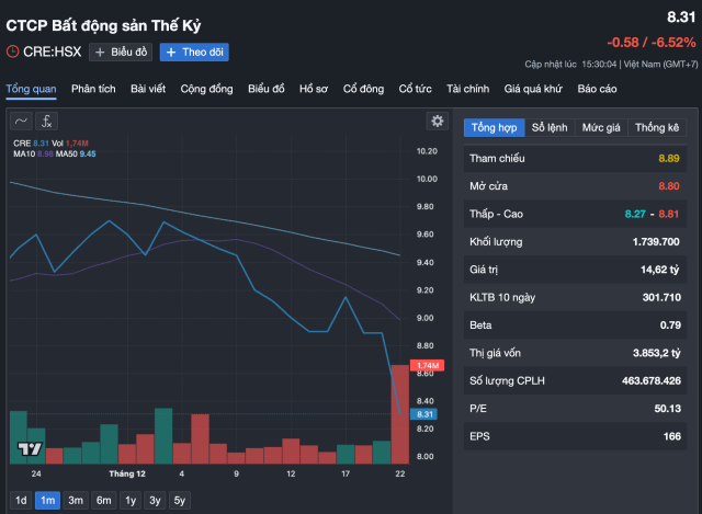 Giá cổ phiếu CRE đóng cửa ở 8.310 đồng, giảm 6,52%, có thời điểm rơi xuống giá sàn. Thanh khoản lên tới 1,7 triệu đơn vị, gấp hơn 5 lần mức trung bình trước đó, khiến nhà đầu tư bất ngờ và lo ngại. So với đầu tháng 12, cổ phiếu này đã mất hơn 14% giá trị, tạo áp lực lớn cho cổ đông.