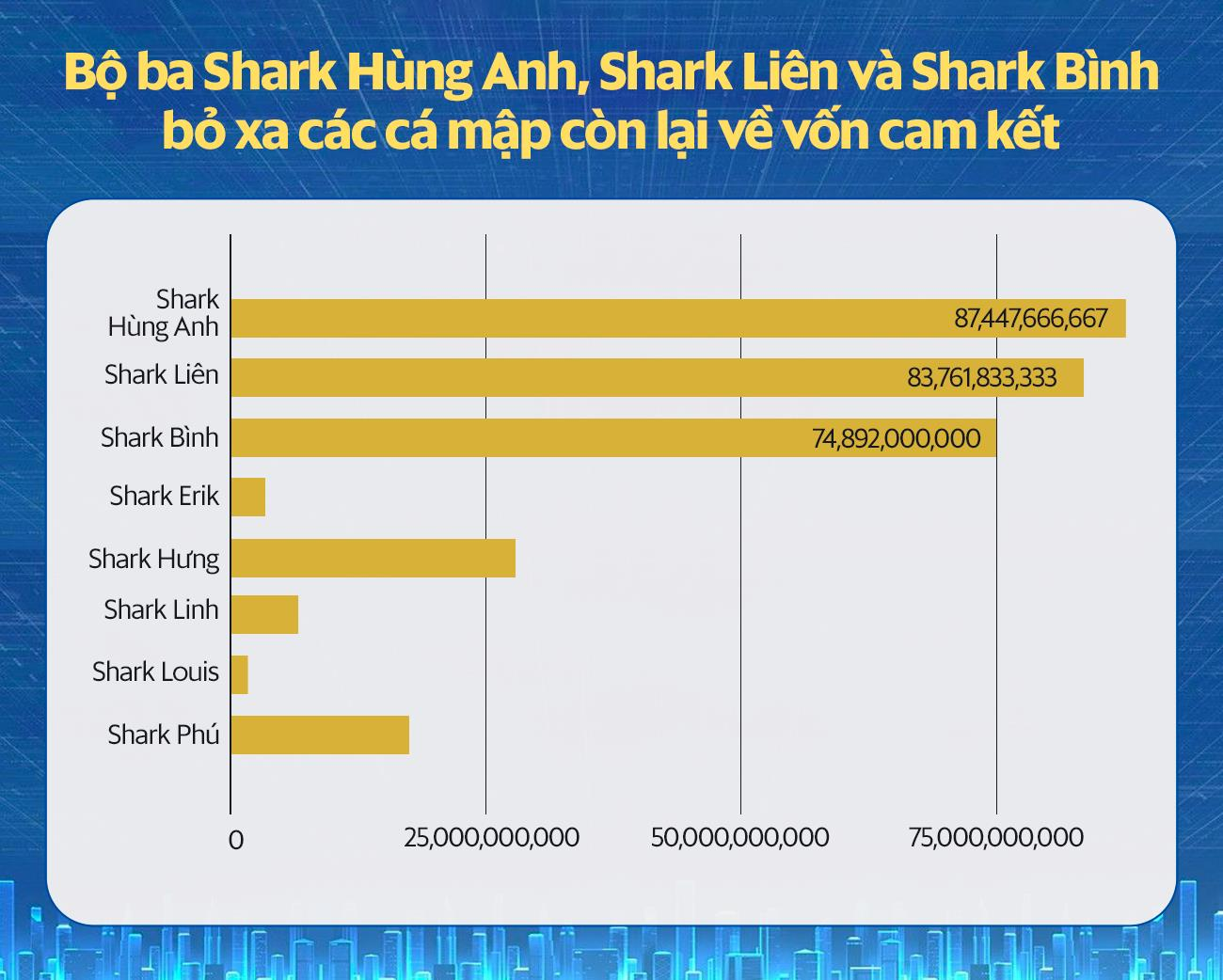Theo số liệu ghi nhận từ mùa Shark Tank gần đây nhất, tổng số vốn cam kết sau 14 tập là 305 tỷ đồng dành cho 31 startup. Trong đó, có 5 thương vụ triệu USD là hệ thống Anh ngữ Á Châu, nhãn hàng Nerman, hãng thời trang Melya, EM&AI và doanh nghiệp cung cấp gỗ tự nhiên bảo hành 10 năm e-Timber.