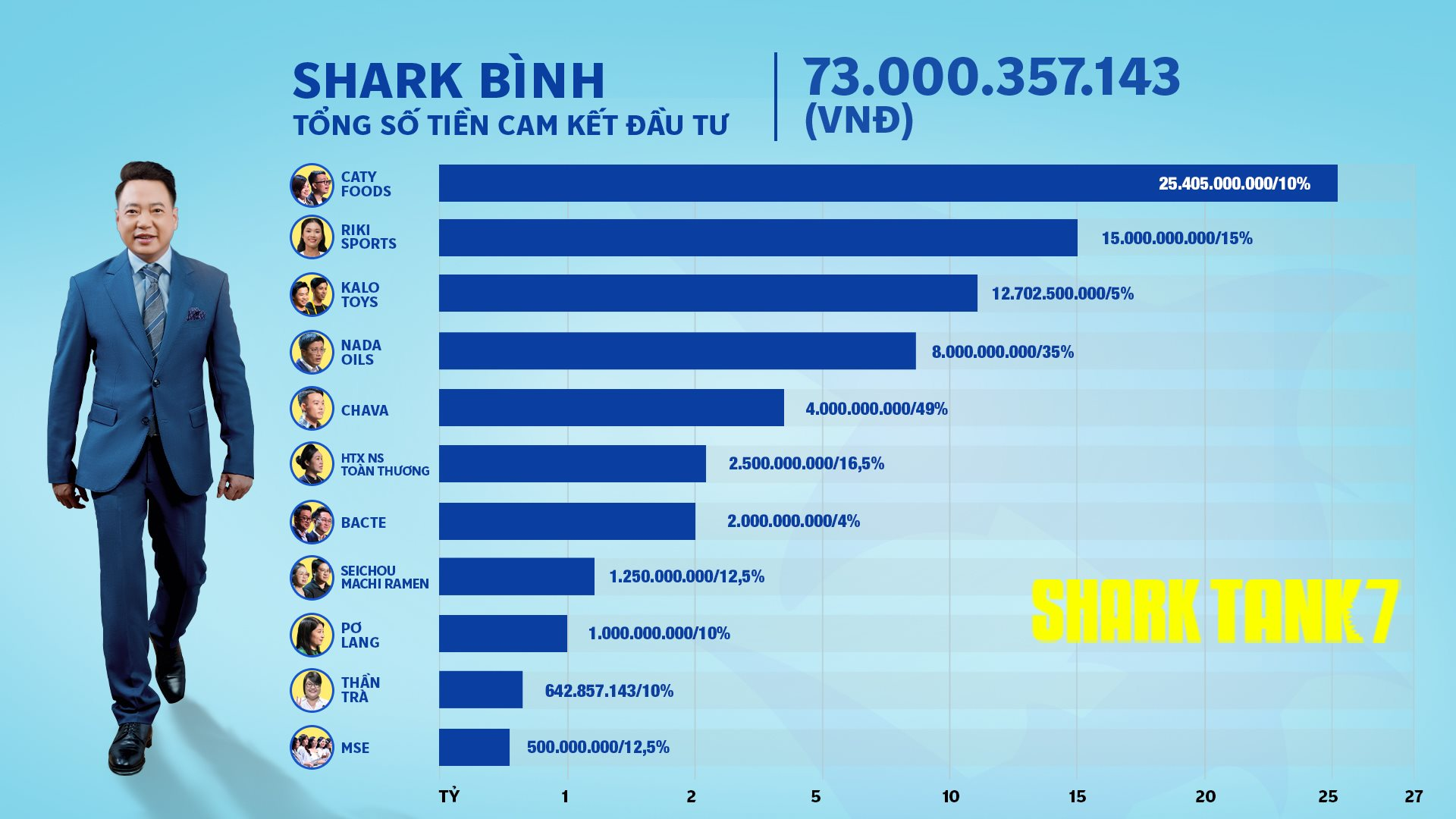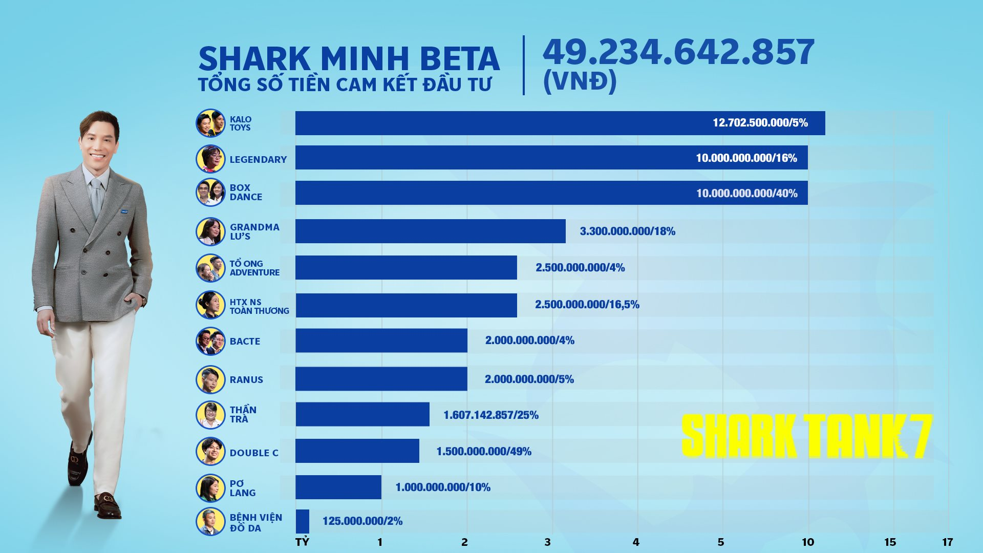 Là hai Shark ngồi trọn vẹn tất cả các tập của Shark Tank Việt Nam mùa 7, Shark Nguyễn Hòa Bình và Shark Minh Beta dẫn đầu bảng tổng sắp với lần lượt số tiền cam kết đầu tư là hơn 73 tỷ đồng và hơn 49 tỷ đồng.