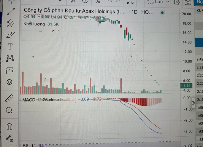 Phiên giao dịch 14-12, cổ phiếu IBC của Công ty Apax Holdings đã giảm sàn 16 phiên liên tiếp, giá cổ phiếu chỉ còn 4.940 đồng, giảm 74% từ đầu tháng 11 đến nay và giảm đến 245% từ đầu năm 2022.