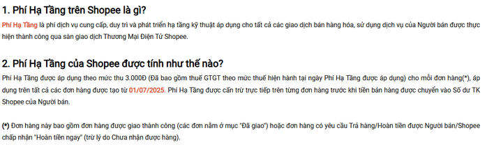 Theo Shopee, chính sách này áp dụng cho các đơn hàng được giao thành công hoặc đơn hàng có yêu cầu trả hàng/hoàn tiền được người bán/Shopee chấp nhận "hoàn tiền ngay" (trừ lý do chưa nhận được hàng). "Phí hạ tầng là phí dịch vụ cung cấp, duy trì và phát triển hạ tầng kỹ thuật áp dụng cho tất cả các giao dịch bán hàng hóa, sử dụng dịch vụ của người bán được thực hiện thành công qua sàn"- Shopee giải thích.
