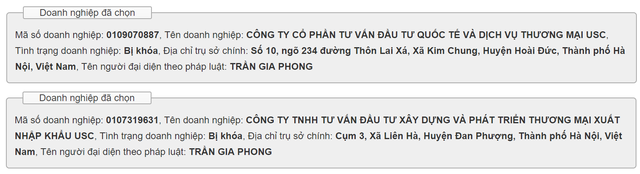 Người đại diện theo pháp luật của USC Interco là ông Trần Gia Phong còn là người đại diện theo pháp luật của Cty TNHH Tư vấn đầu tư Xây dựng và Phát triển thương mại Xuất nhập khẩu USC (USC IETDACI) và công ty này cũng ở trong tình trạng Bị khóa.