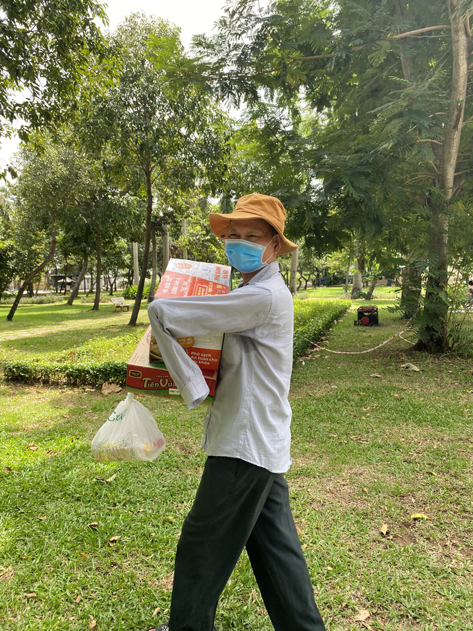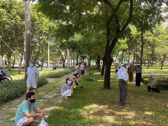 Từ 9 giờ sáng 6-8, "siêu thị mini di động" mới có mặt tại Công viên khu Đông Thủ Thiêm (phường Bình Trưng Đông, TP Thủ Đức) nhưng đã có sẵn nhiều người dân đeo khẩu trang, xếp hàng, giữ khoảng cách, chờ đo thân nhiệt để được lên xe mua hàng.