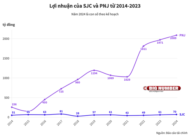 Nếu lợi nhuận của PNJ được cải thiện theo từng năm, chỉ chững lại ở giai đoạn Covid-19 thì chỉ số này tại SJC gần như đi ngang. Theo đó, trong một thập kỷ kinh doanh, mức tăng trưởng lợi nhuận trung bình của SJC chỉ đạt hơn 12,5%, trong khi, tại PNJ gấp gần 3 lần, đạt 35%.