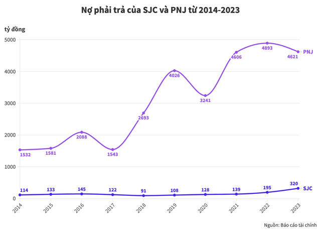 Một khác biệt nữa của hai ông lớn kinh doanh kim loại quý nằm ở "đòn bẩy tài chính" – nợ. Trong khi, PNJ luôn sử dụng đòn bẩy tài chính chiếm gần 45% nguồn vốn, SJC chỉ duy trì mức nợ rất ít, chiếm trung bình chưa đầy 9% tổng số vốn trong 10 năm qua.