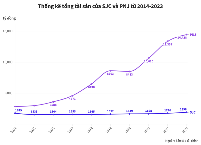 Cuối cùng, trong khi tổng tài sản của PNJ trì trạng thái tăng liên tục thì SJC gần như không biến đổi.