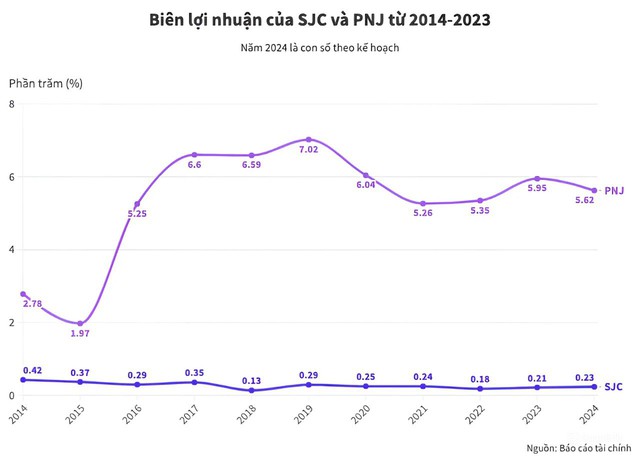 Doanh thu cao, song lợi nhuận thấp cũng khiến biên lợi nhuận của SJC duy trì mức thấp trong suốt gần 1 thập kỷ qua. Trong khi, đối thủ PNJ duy trì biên lợi nhuận từ 2-7%, tùy từng giai đoạn. Điều này có thể lý giải dựa trên đặc thù kinh doanh của từng doanh nghiệp. Tại SJC, do đặc thù kinh doanh vàng miếng, nên dù thuộc câu lạc bộ doanh nghiệp tỷ USD, công ty này mỗi năm chỉ mang về biên lợi nhuận cực mỏng, trung bình khoảng 0,3%.