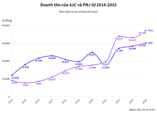 Trong một thập kỷ kinh doanh, SJC và PNJ liên tục rượt đuổi nhau về doanh thu. Trong giai đoạn từ 2014-2020, SJC dẫn trước đối thủ về chỉ số này, tuy nhiên, bước ngoặt xuất hiện từ năm 2021.