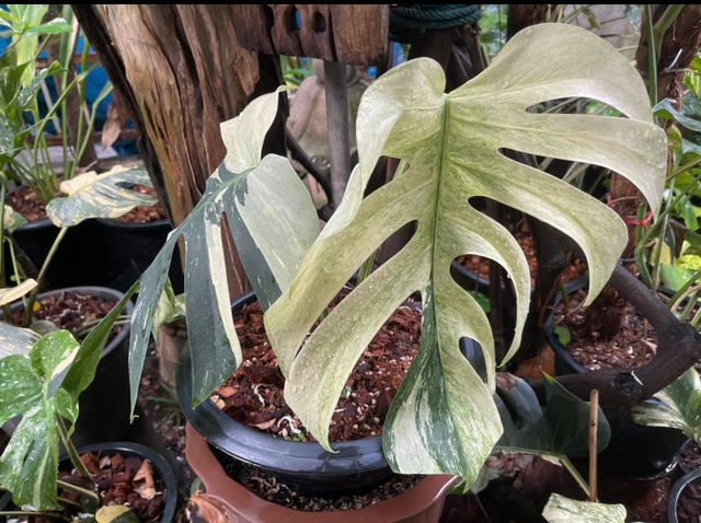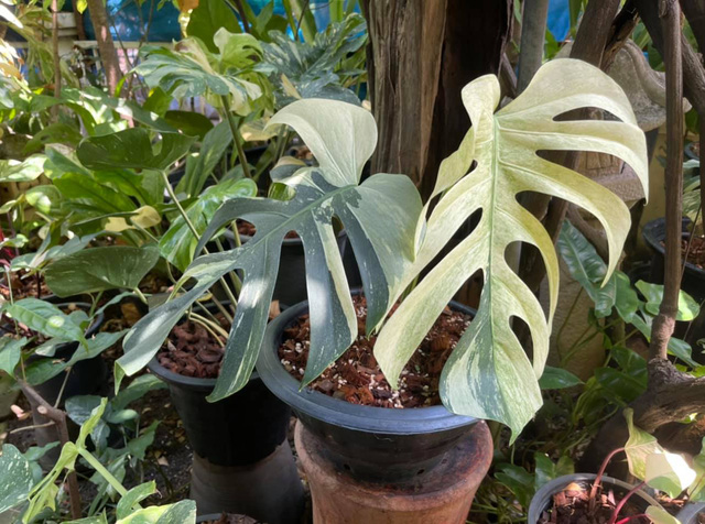 Trong giới chơi kiểng lá, Monstera đột biến lá thường mang 2 màu, nửa xanh, nửa trắng hoặc vàng, giá thành của các cây có lá đột biến này thường cao và được nhiều người săn lùng.