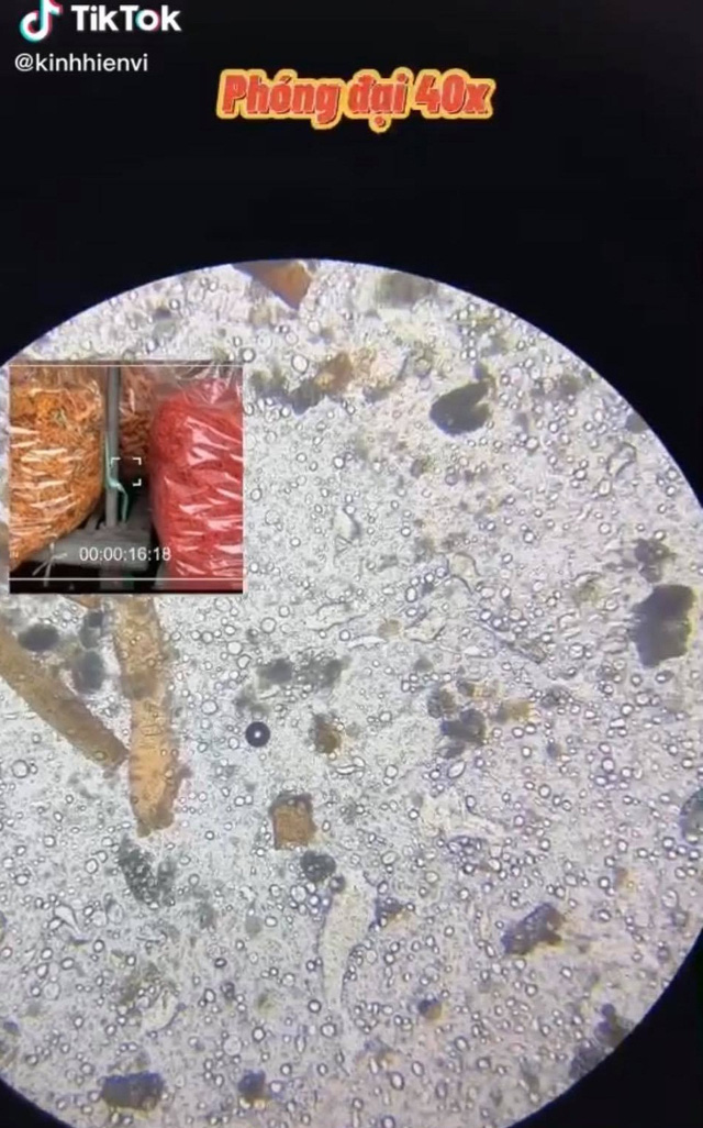 Trong video, có thể thấy trong bò khô mua với giá 170k/kg ngoài chợ, người soi kính đã phát hiện ra bã sắn dây và thịt lợn được trộn chung trong các loại nguyên liệu. Thêm vào đó, khi phóng đại lên nhiều lần, những con vi khuẩn cũng dần hiện ra.