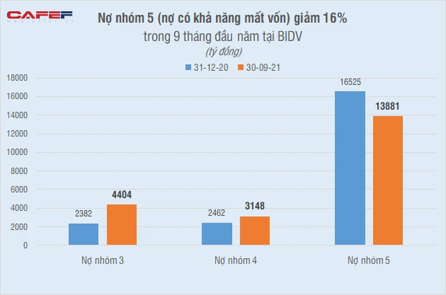 Nợ xấu tại BIDV lại có diễn biến khả quan hơn so với với 2 ngân hàng trên khi duy trì đi ngang so với đầu năm, cuối tháng 9 ở mức 21.433 tỷ đồng. Trong đó, nợ nhóm 3 tăng 85%, nợ nhóm 4 tăng 28%, nợ nhóm 5 lại giảm 16% xuống 13.881 tỷ đồng. Tỷ lệ nợ xấu giảm từ 1,76% xuống 1,61%. Tỷ lệ bao phủ nợ xấu đạt 140%.