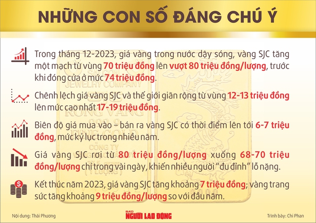Còn khi giá vàng thế giới vừa nhích nhẹ, giá vàng SJC lại bứt phá cả triệu đồng/lượng. Thể hiện rõ nhất là giai đoạn thị trường vàng thế giới đóng cửa nghỉ lễ Giáng sinh nhưng giá vàng SJC lại tăng dựng đứng, lần lượt phá các đỉnh 76, 77, 78… thậm chí vượt 80 triệu đồng/lượng chỉ trong nháy mắt vào ngày 26-12.