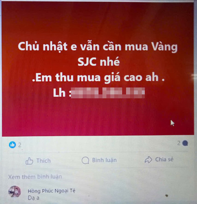 Trong khi việc mua bán vàng ở công ty SJC và các ngân hàng thương mại cũng như tại các tiệm vàng khá trầm lắng, thậm chí ế ẩm thì trên các hội nhóm, mạng xã hội, vẫn có nhiều người rao mua, rao bán vàng miếng số lượng lớn. "Nhiều bên nghỉ nhưng bên em vẫn thu vào vàng SJC. Ai còn vàng alo 078 398… nhé ! Em cần mua 20 cây giá cao" - một tài khoản Facebook có tên Hồng Phúc Ngoại Tệ chào mời một hội nhóm mua bán vàng.